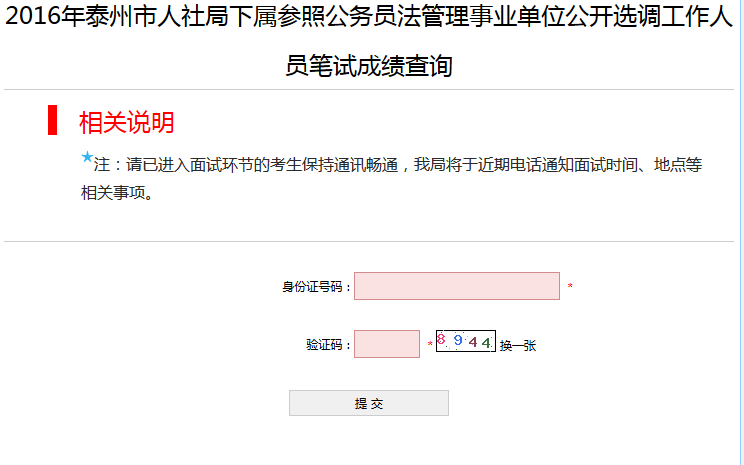 2016年泰州市人社局下屬參照公務(wù)員法管理事業(yè)單位公開選調(diào)工作人員筆試成績查詢