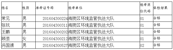 2016泰州市海陵區環境監管執法大隊招聘體檢結果