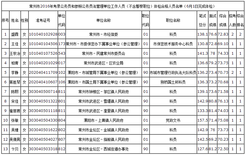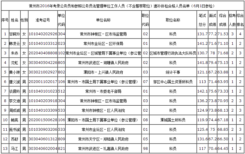 常州市2016年考錄公務員和參照公務員法管理單位工作人員(除警察職位)體檢結果公布(三)
