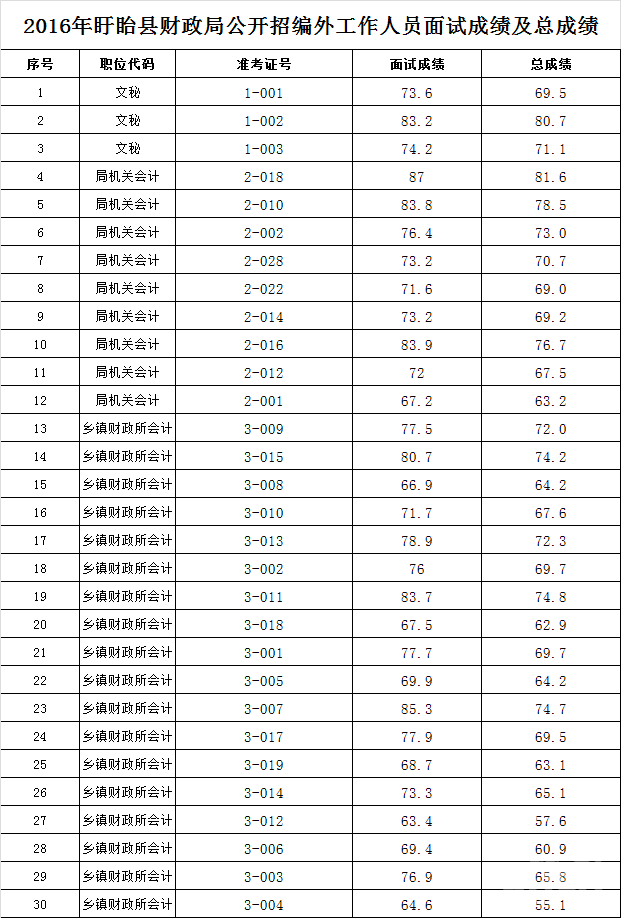 2016年淮安市盱眙縣財政局招聘面試成績及總成績