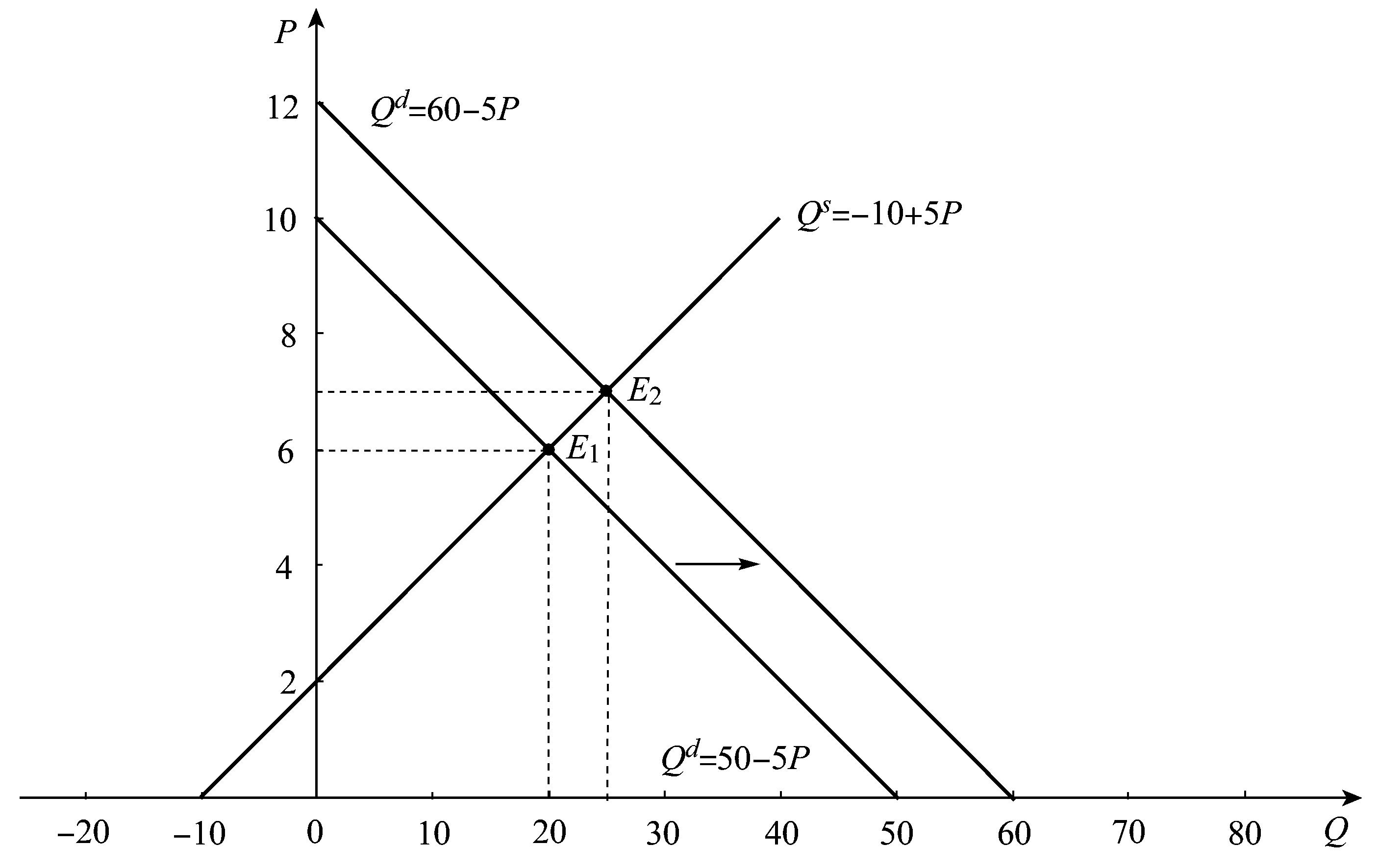 而所謂的比較靜態分析是考察當原有的條件發生變化時,原有的均衡狀態會發生什么變化,并分析比較新舊均衡狀態。也可以說,比較靜態分析是考察在一個經濟模型中外生變量變化時對內生變量的影響,并分析比較由不同數值的外生變量所決定的內生變量的不同數值,以(2)為例加以說明。在圖2—2中,由均衡點E1變動到均衡點E2就是一種比較靜態分析。它表示當需求增加即需求函數發生變化時對均衡點的影響。很清楚,比較新、舊兩個均衡點E1和E2可以看到:需求增加導致需求曲線右移,最后使得均衡價格由6上升為7,同時,均衡數量由20增加為25。也可以這樣理解比較靜態分析:在供給函數保持不變的前提下,由于需求函數中的外生變量發生變化,即其中一個參數值由50增加為60,從而使得內生變量的數值發生變化,其結果為,均衡價格由原來的6上升為7,同時,均衡數量由原來的20增加為25。