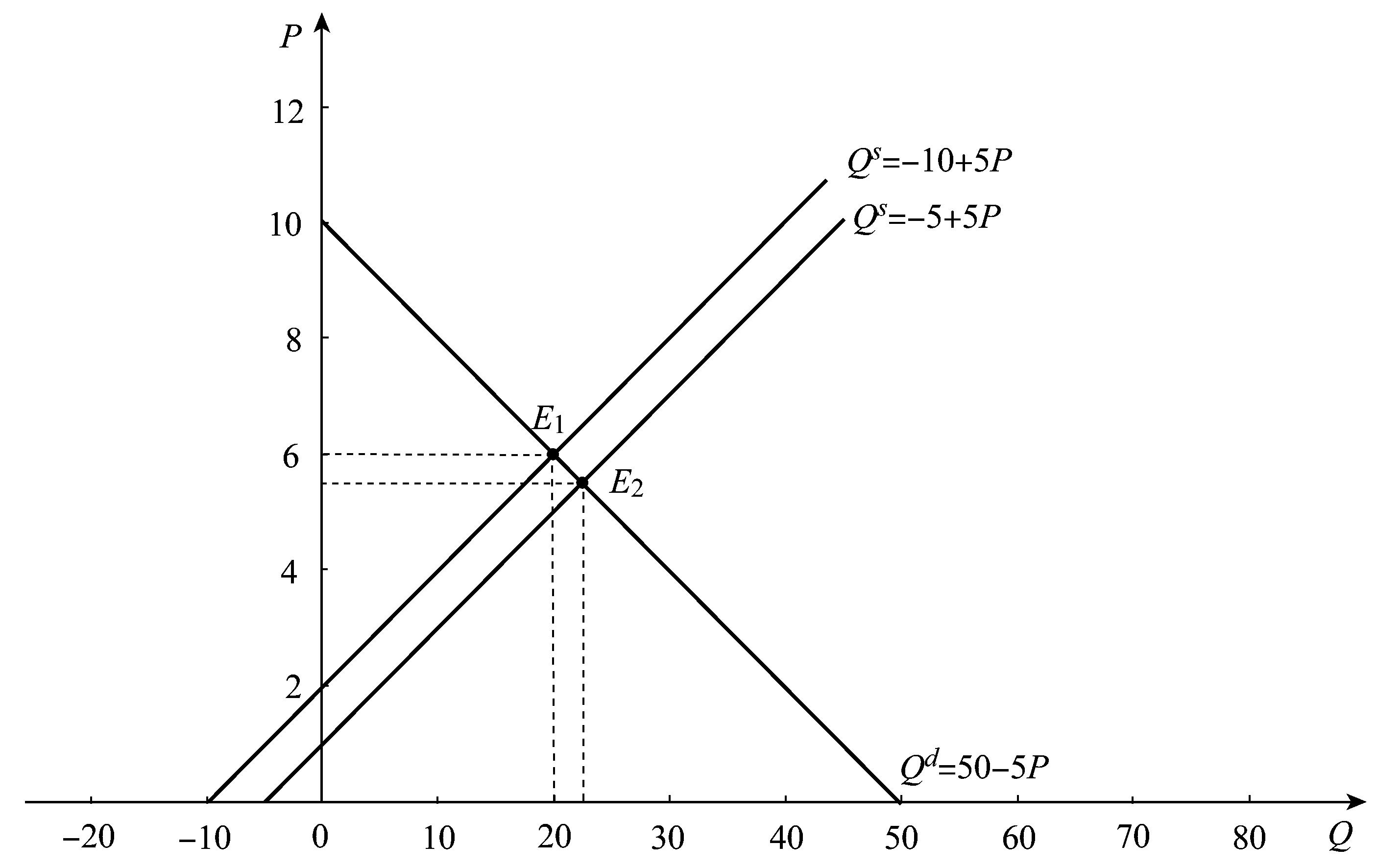 由(1)和(3)可見,當技術水平提高導致供給增加,即表現為供給曲線右移時,均衡價格下降了,均衡數量增加了。
