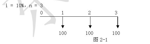 普通年金又稱后付年金,是指各期期末收付的年金。普通年金的收付形式如圖2—1。橫線代表時間的延續,用數字標出各期的順序號;豎線的位置表示支付的時刻,豎線下端數字表示支付的金額。