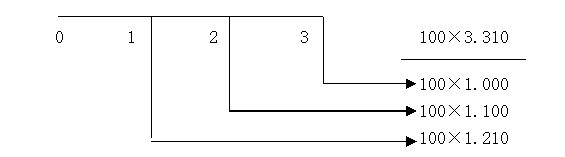 在第一期末的100元,應賺得2期的利息,因此,到第三期末其值為121元;在第二期末的100元,應賺得1期的利息,因此,到第三期末其值為110元;第三期末的100元,沒有計息,其價值是100元。整個年金終值331元。