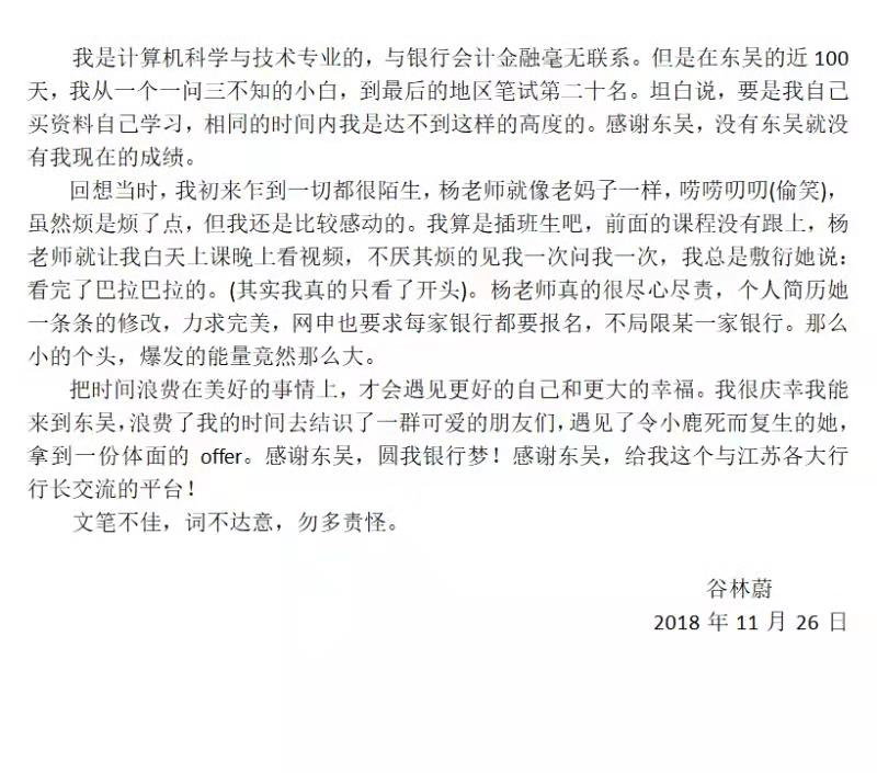 我是計算機科學與技術專業的,與銀行會計金融毫無關系。但是在東吳的近100天,我從一個一問三不知的小白,到最后的地區筆試第二十名。坦白說,要我自己買資料自己學習,相同的時間內我是達不到這樣的高度的,感謝東吳,沒有東吳就沒有我現在的成績。