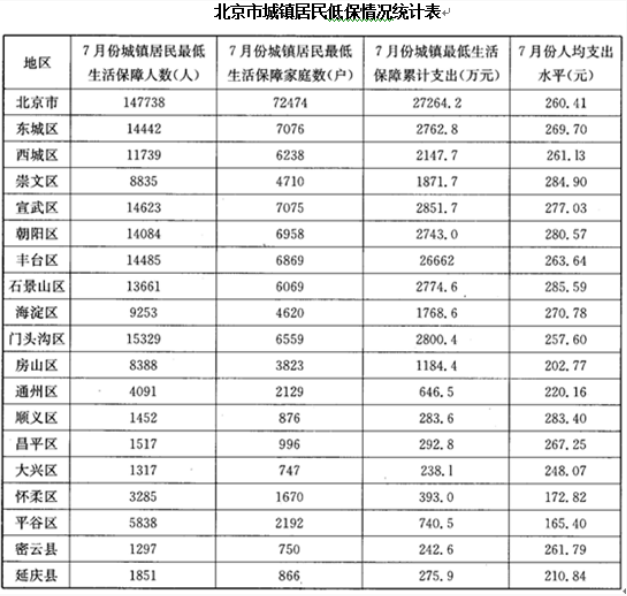 1.2012年7月份北京市下列各區縣中城鎮居民最低生活保障人數最少的是(  )